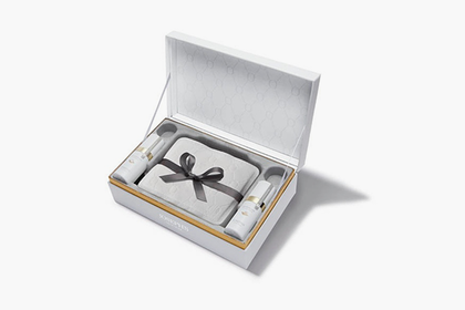 В набор также входят полотенце и увлажняющие средства для кожи. Все предметы упакованы в коробку, обитую натуральной кожей.