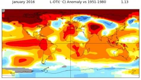 По данным климатологов из проекта Climate Central, январь 2016 года на 1,13 градуса теплее среднестатистических показателей. Таким образом, средняя температура на планете четвертый месяц держит своеобразный рекорд, превышая норму на 0,5–1 градус. Исходя из карт НАСА, потепление наблюдалось во всех регионах планеты, однако в Средней Азии, в заполярных и арктических регионах Евразии и Северной Америки значения температуры были от 4 до 12 градусов выше нормы.