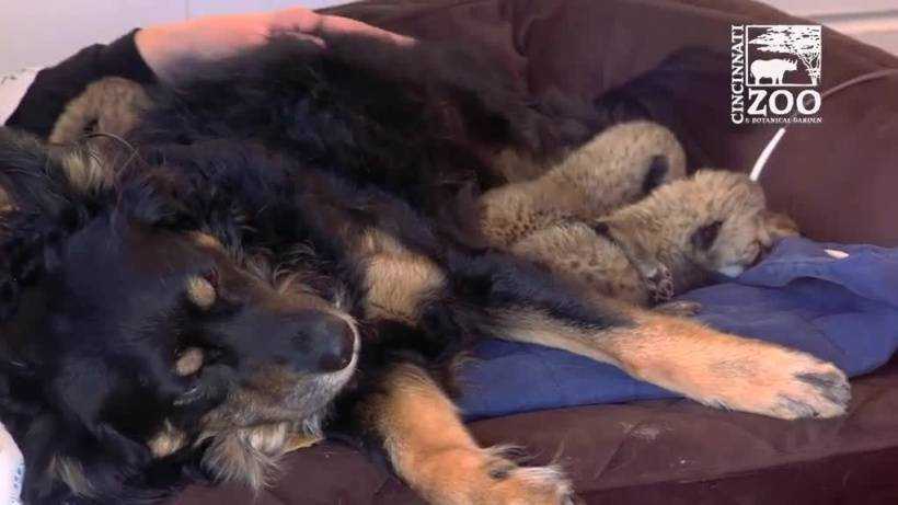 В США овчарка по кличке Блейкли в зоопарке Цинциннати воспитывает пятерых детенышей гепарда.