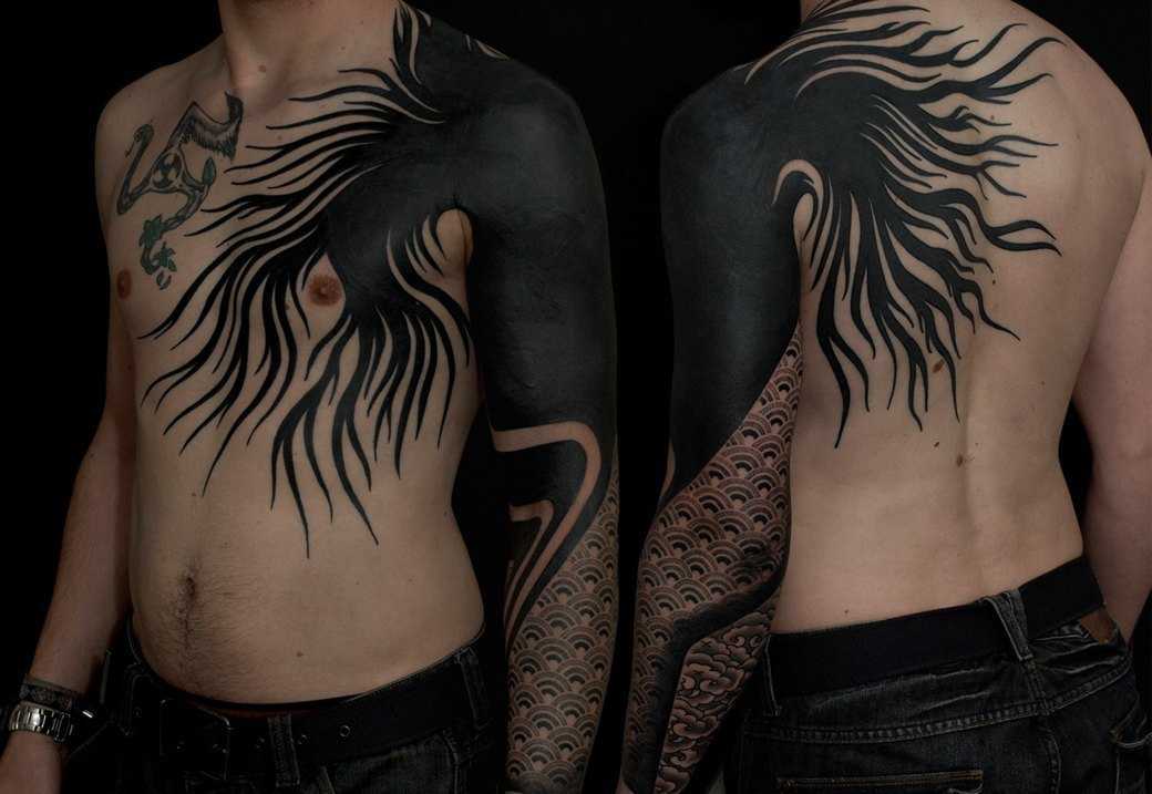 Новый стиль татуировки получил название блэкворк (blackwork). При создании таких работ используется исключительно черный цвет, а кроме того, под них отводятся довольно большие участки кожи.