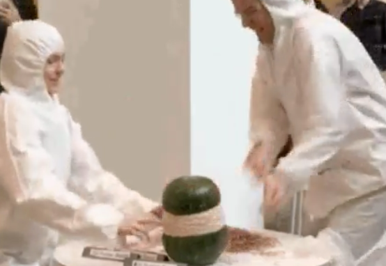 Арбуз лопнул примерно спустя 45 минут после начала трансляции. Для этого авторам эксперимента понадобилось более 680 резинок, натянутых одна поверх другой.