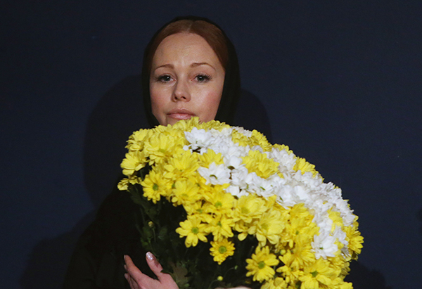 Однако внимание прессы привлекла актриса Елена Корикова. Для выхода в свет звезда сериала "Бедная Настя" выбрала скромный черный наряд и платок, прикрывающий волосы. (Отметим, артистка сменила цвет волос, и теперь не блондинка). Она держала мелкие бело-желтые хризантемы. К слову, это первое за несколько лет появление Кориковой на публике. Уже давно она не посещает светские мероприятия, не снимается для прессы и вообще ведет закрытый образ жизни.