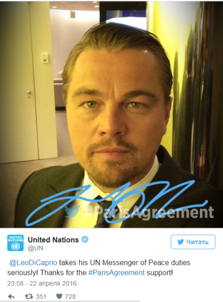 Первое селфи Леонардо Ди Каприо сделал во время перерыва, когда прилетел с докладом на мероприятие по заключению Парижского соглашения о климате. Вскоре в официальном аккаунте ООН в Twitter появилась эта фотография актера, да еще и с автографом. «Лео ДиКаприо ответственно относится к своим обязанностям посла ООН», - гласила подпись к селфи звезды «Выжившего».