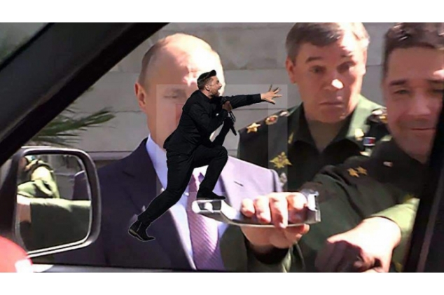 Фаворита России на победу в песенном конкурсе сравнивали и с птицей, которую оседлал Путин и тянущегося за спиртным на ступеньках. Обыграли пользователи недавний конфуз путинских генералов, которые оторвали ручку от двери российского внедорожника. Именно на оторванной ручке благодаря монтажу и танцевал Лазарев.