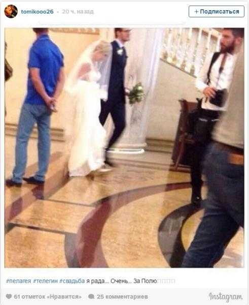 Пока журналисты передают из уст в уста (и прочими средствами связи) информацию о тайном свадебном торжестве Пелагеи и ее избранника, хоккеиста Ивана Телегина, которое якобы состоялось еще 16 июня, в Сети появилась фотография с росписи. На снимке, далекого от совершенства по качеству, запечатлены проходящими по залу предположительно Пелагея в белом свадебном платье и Иван Телегин в синем костюме (при этом почему-то держащий букет невесты).