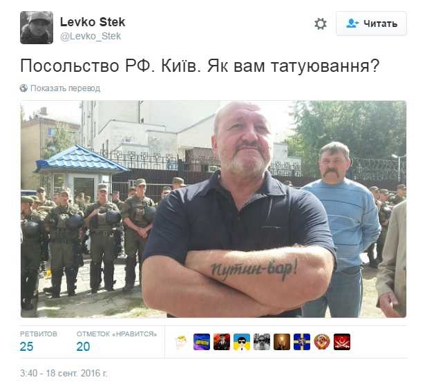 Украинский журналист Левко Стек опубликовал на своей странице в Twitter фото мужчины с татуировкой "Путин – вор" в Киеве у посольства России.