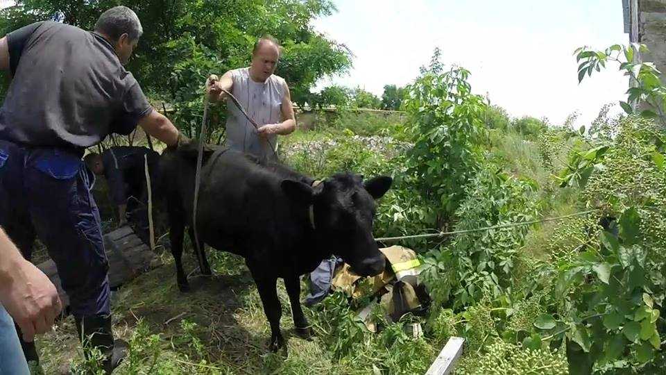 Месяцем ранее стахановским спасателям для извлечения коровы из четырехметрового канализационного колодца пришлось частично демонтировать сооружение при помощи трактора.