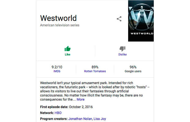 В отличие от других рейтинговых платформ, рейтинг Google не дает оценок в баллах или звездочках. Вместо этого он предлагает пользователям ставить отметки «нравится» или «не нравится». Именно этот рейтинг затем будет выводить поисковик. Кроме того, в рамках новой функции пользователи смогут увидеть рейтинги таких киносайтов, как Rotten Tomatoes и IMDb.