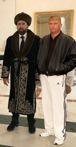 На снимке Кейдж с обреченным лицом стоит рядом со скрипачкой Айман Мусаходжаевой - народной артисткой Казахстана. На актере надет традиционный казахский костюм чапан.