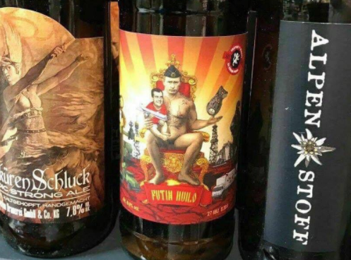На этикетке пива под названием "Putin H*ilo" изображен в карикатурной форме глава Кремля на троне, а на коленях у него сидит Медведев. Также на этикетке можно увидеть экс-президента Украины Виктора Януковича в костюме чебурашки, белые "гуманитарные" КамАЗы, российское оружие, а также "зеленого человечка" - "ихтамнета".