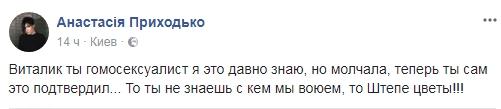 Певица Анастасия Приходько написала в Фейсбуке, что Виталик является гомосексуалистом. Она отметила, что давно об этом знала, но молчала.