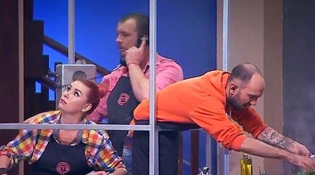 По результатам всех конкурсов на битву черных фартуков попали: Владимир Троцкий, Юлия Морозенко и Алексей Мазницин. Их "заточили" в телефонную будку, в которой участники получали подсказки от судьи шоу Эктора по приготовлению блюд.