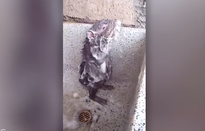 В ролике серая крыса, измазанная чем-то, похожим на мыло, трет себя лапками, копируя движения человека под душем. Автор ролика сообщил, что зверек "мылся" в течение 30 секунд, а затем убежал.