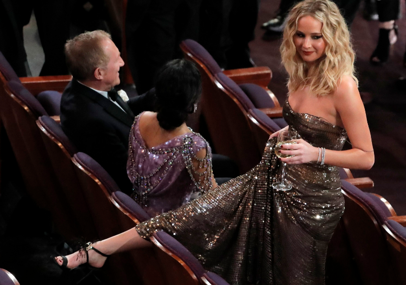 В театре «Долби» в Лос-Анджелесе, где проходило мероприятие, много внимания к своей персоне привлекла звезда «Голодных игр» Дженнифер Лоуренс. Актриса была слегка навеселе. Разгуливая по залу с бокалом вина, она спешила радушно поприветствовать как можно больше коллег по кинематографическому цеху, а затем, чтобы не тратить время, пробиралась к своему месту, просто перешагивая через сидения.