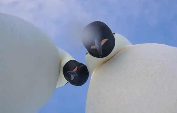 На снятых кадрах видно, как два императорских пингвина с интересом заглядывают в объектив, забавно поворачивая головы в разные стороны.