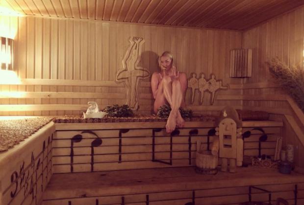 На одном из последних снимков светская львица показала, как она парится в авторской бане, передает Час Пик.