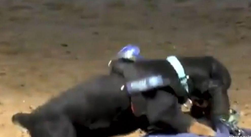 Один из копов упал и притворился мертвым, после чего щенок по кличке Пончо подбежал к нему на помощь. Он прыгал лапами на грудь полицейского и прислушался к его дыханию. Об этом сообщает "ТСН".