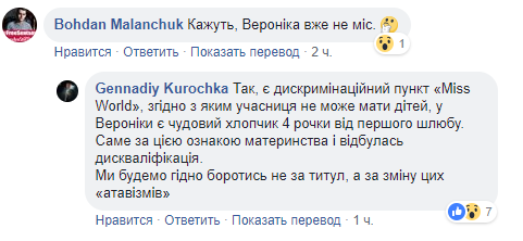 "Есть дискриминационный пункт "Miss World", согласно которому участник не может иметь детей, у Вероники есть замечательный мальчик 4 годика от первого брака. Именно по этому признаку материнства и состоялась дисквалификация.