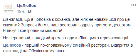 "Узнала, что у мужа есть любовница, но никак не решишься об этом сказать? Пригласи его в наш ресторан и сразу угости десертом. В морду! И контрольный между ног!" - предлагается в другой публикации.