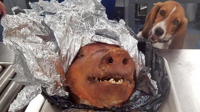 Отмечается, что свиную голову пытался провезти в Америку путешественник из Эквадора. Контрабандиста с запрещенным грузом в сумке выявил служебный бигль.