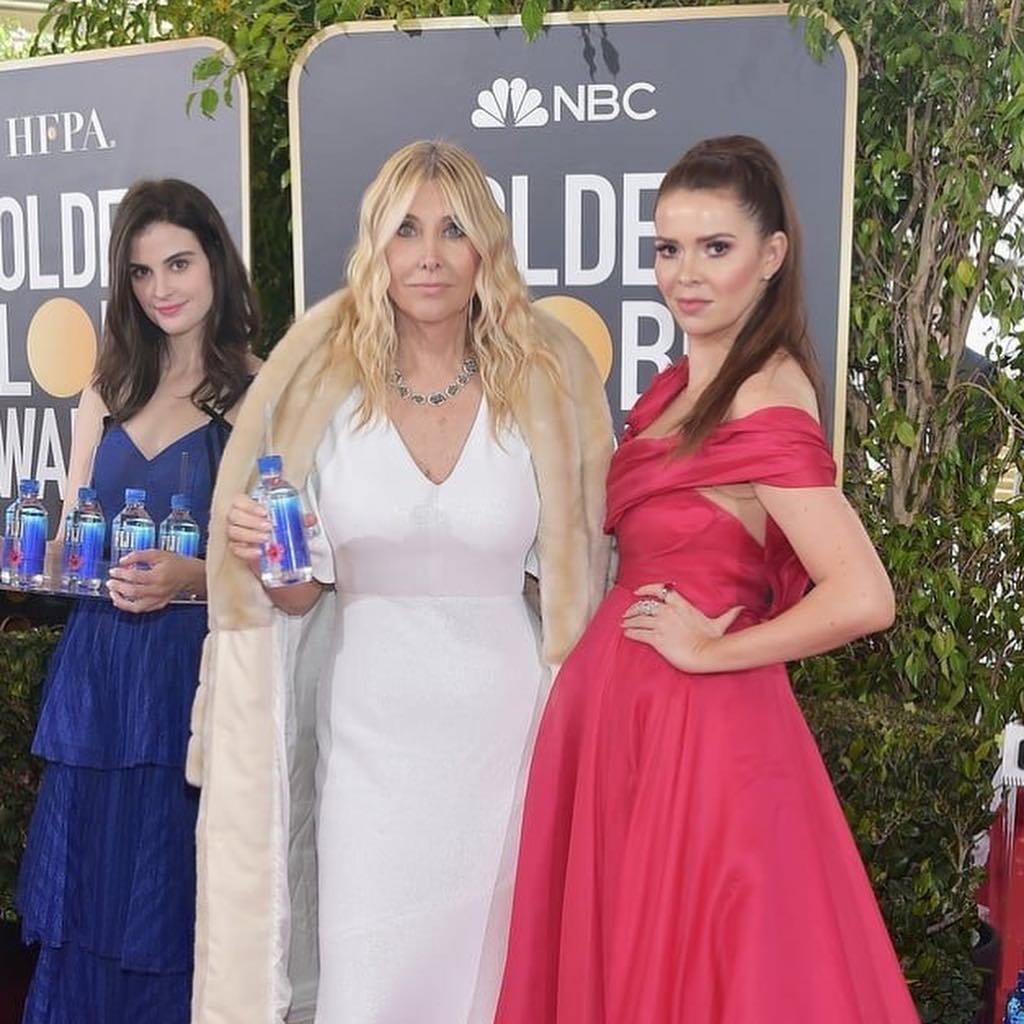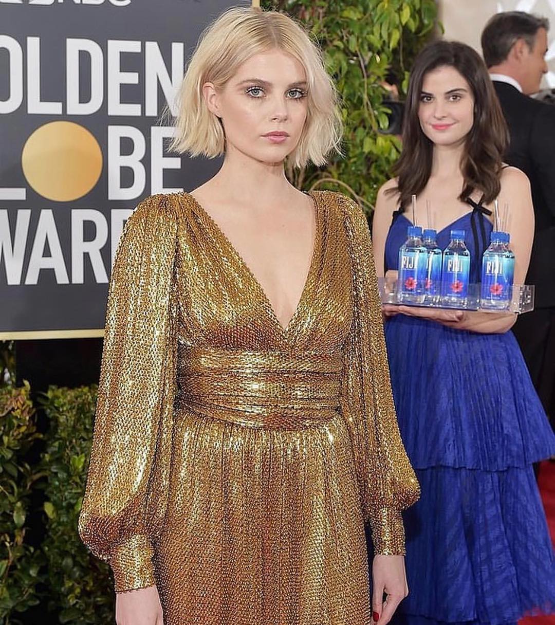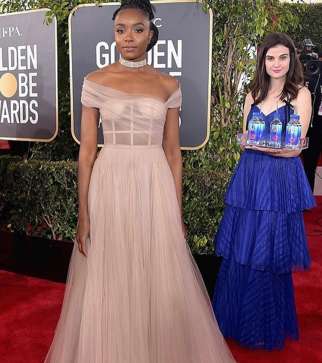 Когда кинозвезды позировали фотографам на красной дорожке, практически на всех кадрах на заднем плане оказалась девушка в синем платье, держащая поднос с бутылками воды "Fiji".