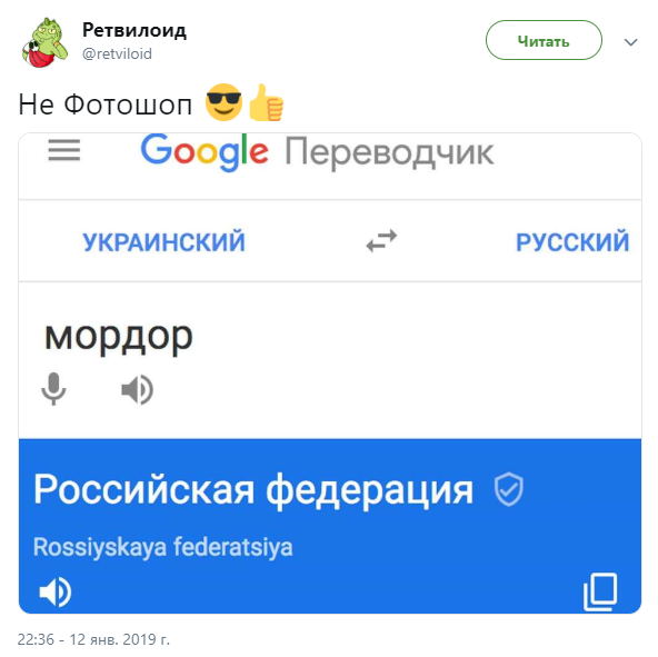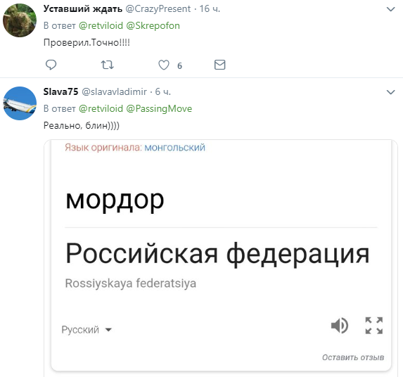 Один из пользователей Твиттера заметил, что в переводчике Google слово "мордор" переводится с украинского языка как "Российская федерация". При этом сервис определяет язык оригинала как монгольский.