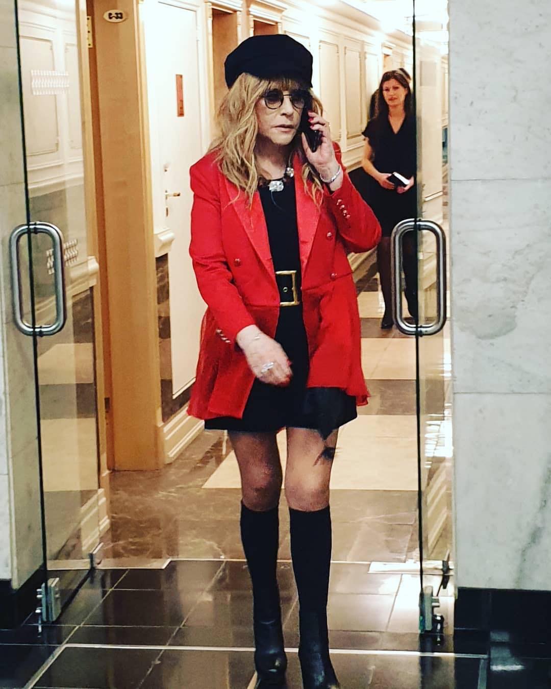 На концерт к своему давнему другу Пугачева пришла заметно похудевшей. Она была одета в черное мини-платье, поверх которого красовалосб красное полупальто. На ногах у певицы были высокие черные сапоги.