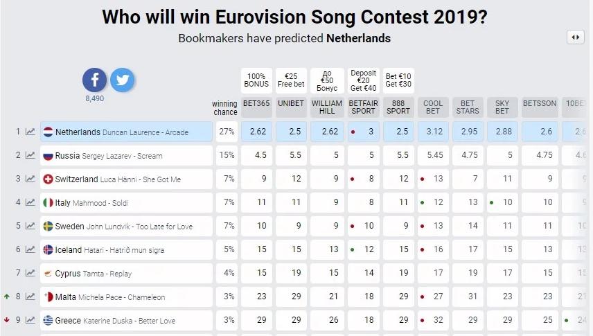 - Место победителя по-прежнему предсказывают Нидерландам, которые представит исполнитель Дункан Лоренс с песней Arcade.