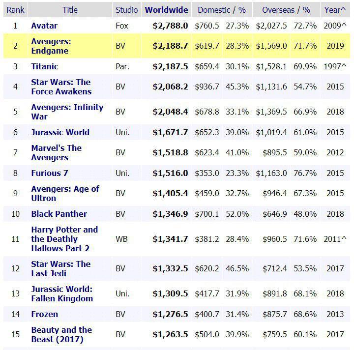 Финальная часть саги братьев Руссо обошла культовый "Титаник" с его $2,187 млрд и заняв второй место в рейтинге самых кассовых фильмов за все время.