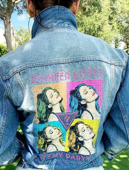 Она опубликовала серию фото в стильном молодежном образе: светлые обтягивающие легинсы, короткая джинсовая куртка с разработанным сцециально для нее принтом. Картинка в духе творчества Энди Уорхола и с надписью "Дженнифер Лопес. Its My Party" получилась стильной и яркой.