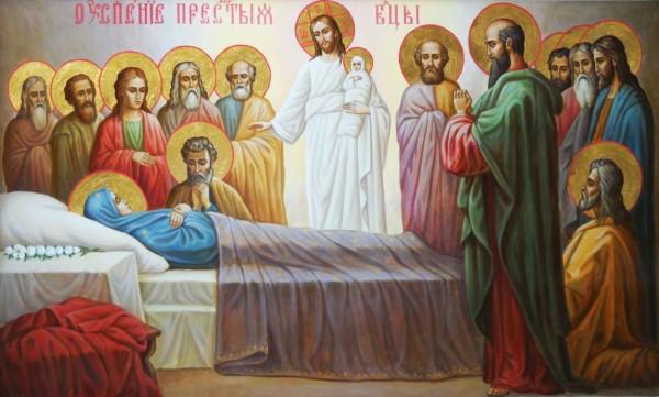 В преданиях сказано, что за три дня до смерти Деве Марии явился архангел Гавриил и сообщил о ее скорой кончине. Желая увидеть перед смертью апостолов, Богородица начала молиться. Тогда ангелы возвестили всех апостолов, разошедшихся по всей земле, и на облаках перенесли их в Иерусалим, в дом Марии. Там явился Иисус с ангелами, после чего Богородица мирно скончалась. На следующее утро апостолы отнесли ее тело в гробницу. Позже Дева Мария переместилась в рай.