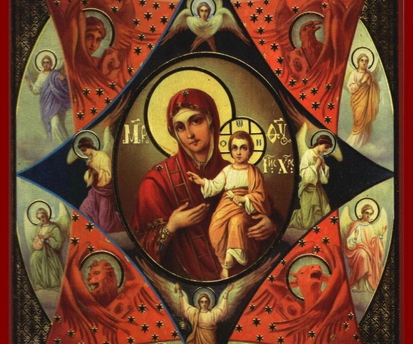Это одна из самых известных икон, которая изображает Деву Марию через ее ветхозаветный образ - неопалимую купину. Так назывался куст, горящий, но несгораемый, в виде которого Моисею явился Господь. Со временем этот образ трансформировался в предание о непорочном зачатии Богородицы.
