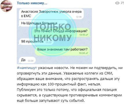 Телеграм-канал "Только никому" обнародовал скрин переписки, в которой сказано, что Заворотнюк скончалась, передает Час Пик.