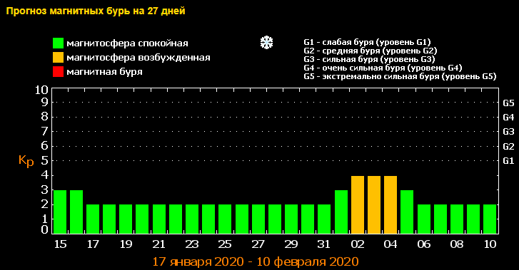 Активность магнитосферы будет повышена со 2 по 4 февраля, также влияние этого процесса будет ощущаться еще сутки до и после магнитного шторма. Однако активность солнечного ветра все же будет недостаточной, чтобы классифицировать событие как магнитную бурю.