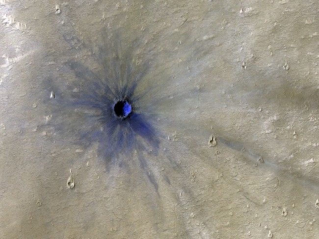 На снимке можно увидеть четкие лучи, расходящиеся от центра кратера, что свидетельствует о его свежести. Также обращает на себя внимание странный синий цвет вокруг кратера. Астрономы сходятся во мнении, что это признак базальтовых пород, которые поднялись из недр марсианской почвы во время столкновения с астероидом.