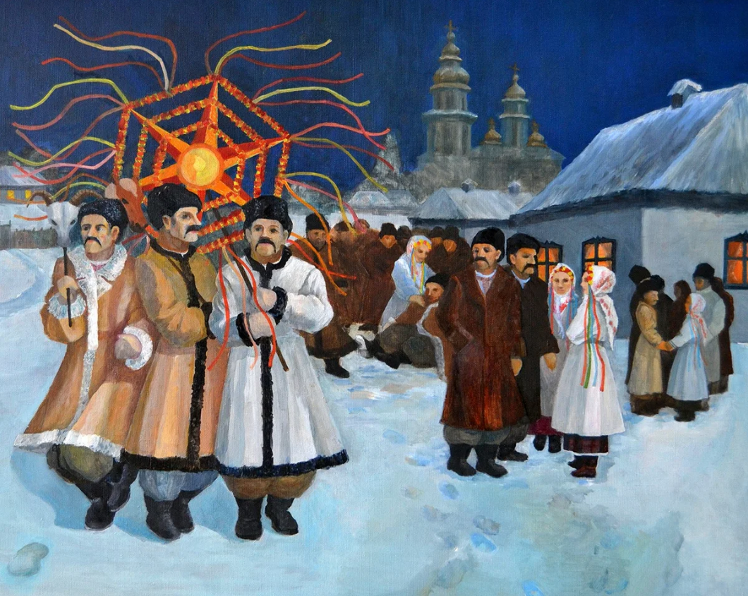 Обычно рождественские группы колядующих состояли из молодых парней, которые наряжались в костюмы цыгана, козы, черта и т.п. Обязательным атрибутом была яркая звезда на палке. В Сочельник эти веселые компании ходили от дома к дому и пели колядки, а хозяева одаривали их гостинцами или деньгами.