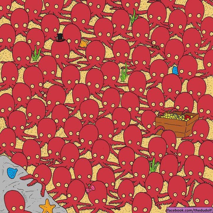 Картинка, представленная выше, имеет небольшую тайну, которую вам предстоит разгадать. Среди большого количество осьминожек прячется рыбка.