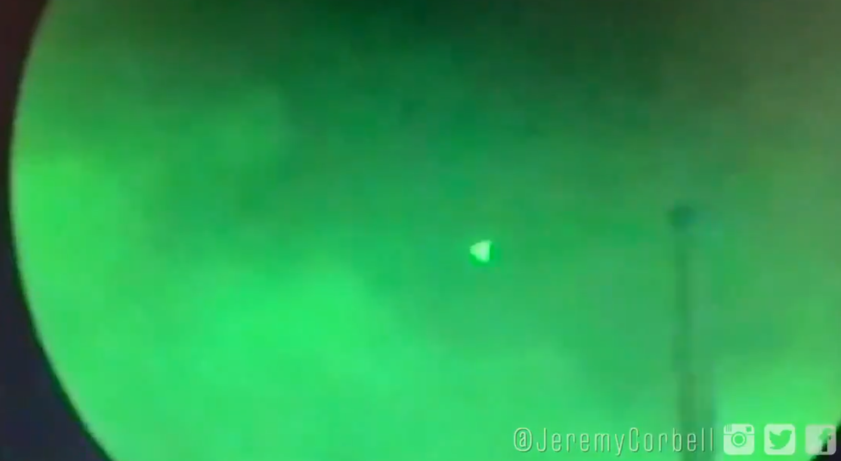 Видео опубликовал в своем Твиттере режиссер-документалист Джереми Корбелл. На кадрах, снятых при помощи прибора ночного видения, видны объекты неизвестного происхождения треугольной формы, парящие высоко над палубой эсминца ВМС США.