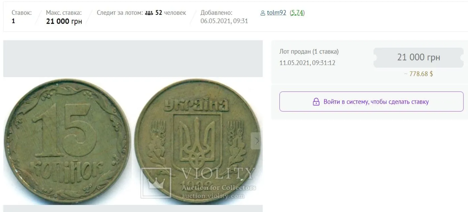 Сейчас украинские 15 копеек стоят бешеных денег. На интернет-аукционах такие лоты предлагаются по цене 14 тысяч, 20 тысяч, а то и 30 тысяч гривен.