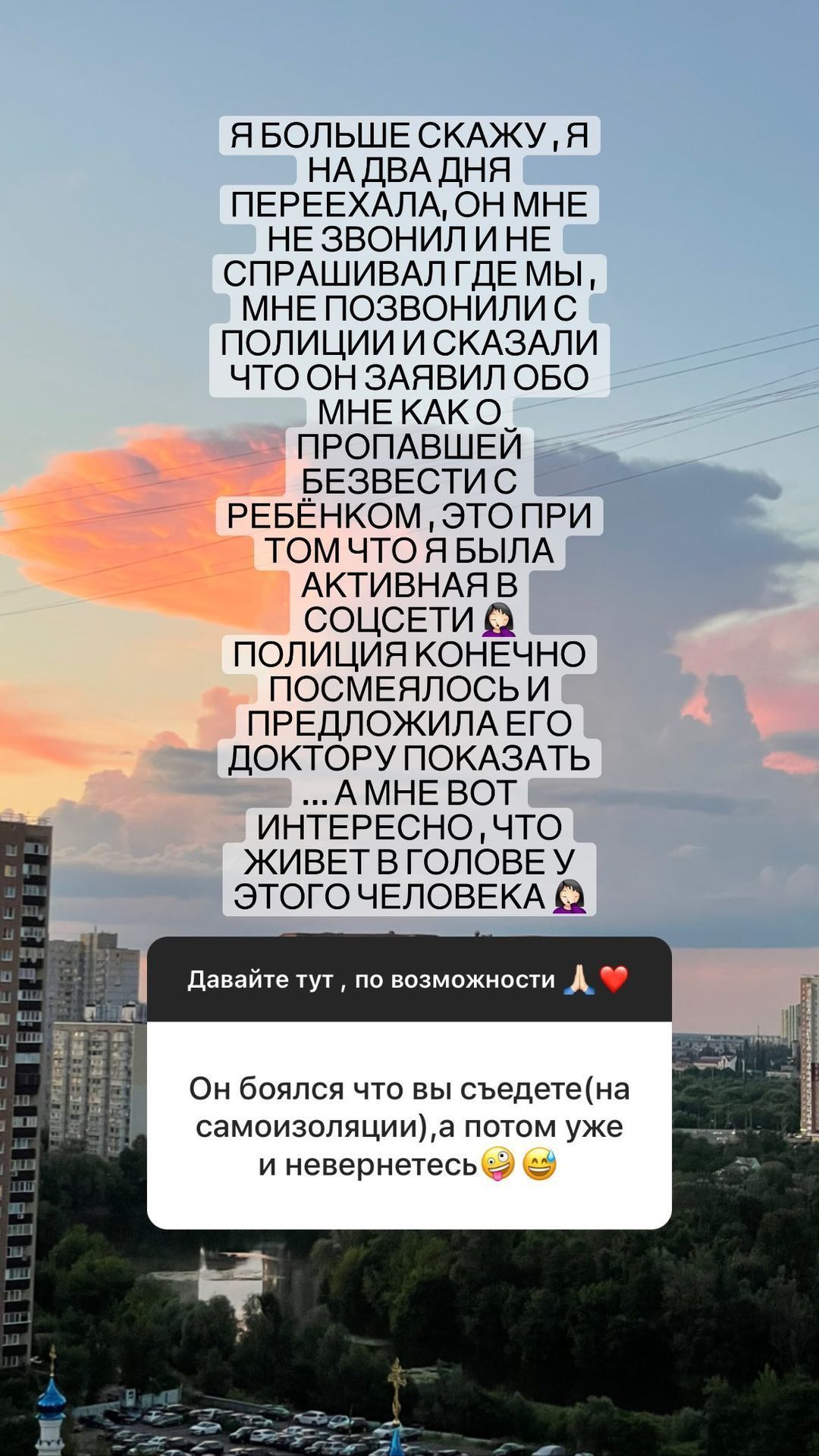 "Я на два дня переехала, он мне не звонил и не спрашивал, где мы. Мне позвонили из полиции и сказали, что он заявил обо мне как о пропавшей без вести с ребенком. Это тогда, как я была активной в соцсети. Полиция, конечно, посмеялась и предложила его доктору показать. А мне вот интересно, что живет в голове у этого человека", - написала Юлия в одном из своих постов.