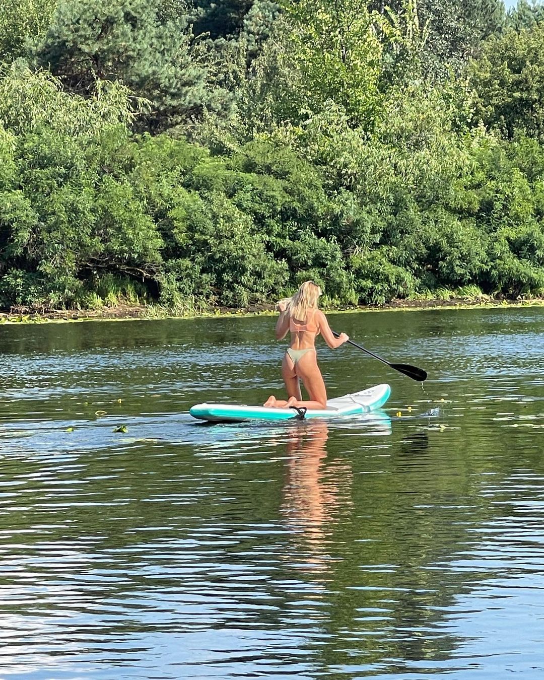 Никитюк решила освоить сап-серфинг и выбрала для этого события "голый" купальник, который почти сливается с телом.