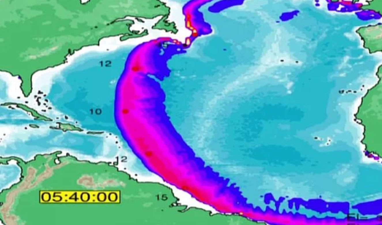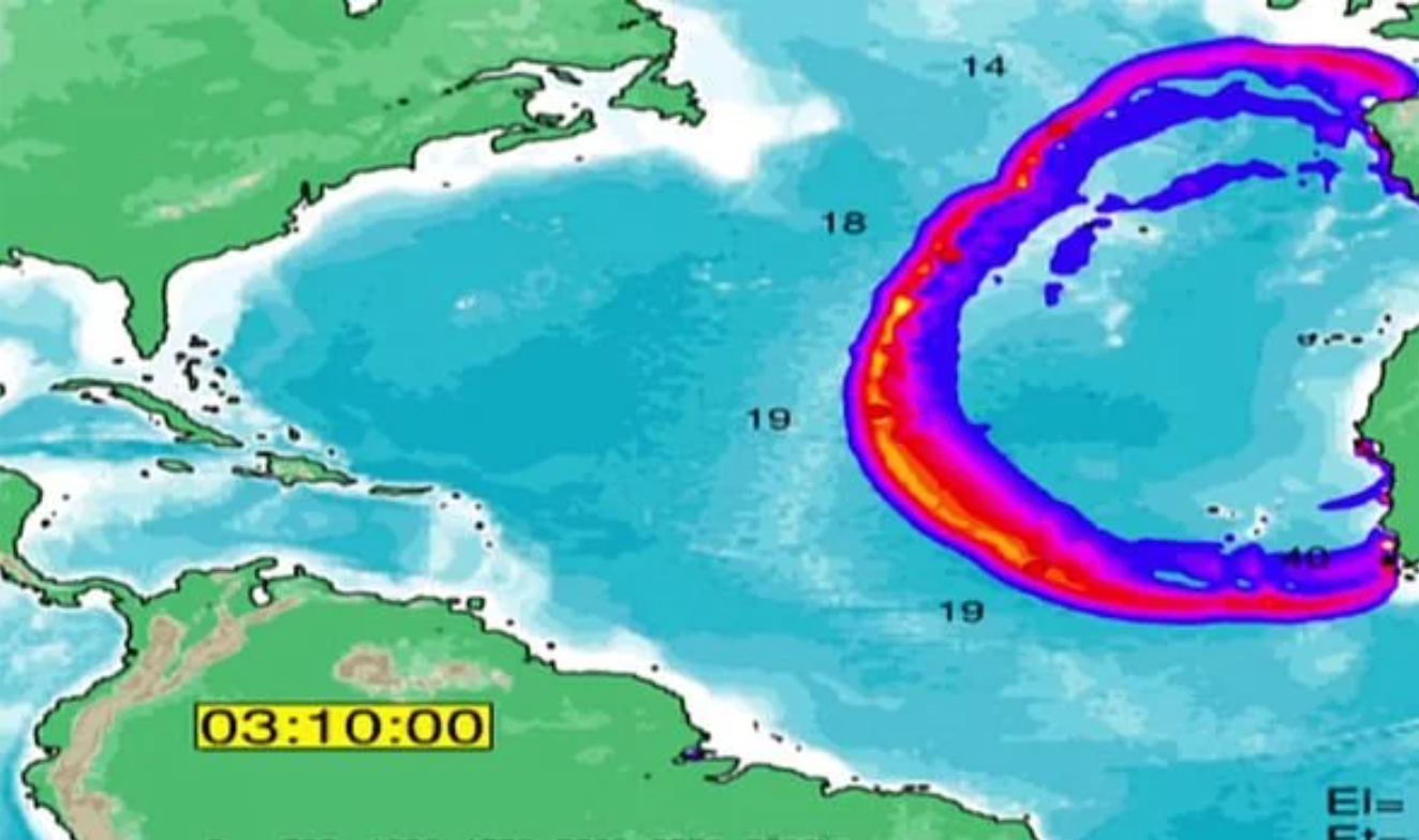Макгуайр считает, что падение пород в океан приведет к образованию водного купола высотой почти 3000 футов (около 900 метров) - «вероятно, больше, чем остров Манхэттен». Волна мегацунами пройдет через Атлантический океан и достигнет восточного побережья Северной Америки.