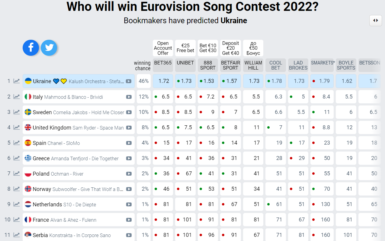 Украина с большой вероятностью победит на международном песенном конкурсе Евровидение-2022, который уже через несколько дней начнется в итальянском Турине.