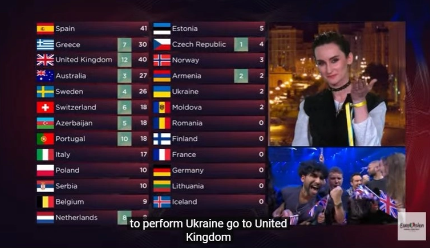 Украинское жюри дало 12 баллов Великобритании, 10 – Португалии, 8 – Нидерландам, 7 – Греции, 6 – Швейцарии, 5 – Азербайджану, 4 – Швеции, 3 – Австралии, 2 – Армении, 1 – Чехии.