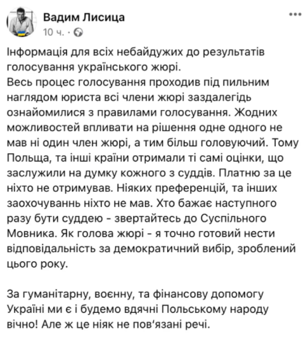 "Весь процесс голосования проходил под пристальным вниманием юриста все члены жюри заранее ознакомились с правилами голосования. Никаких возможностей влиять на решение друг друга не имел ни один член жюри, а тем более председательствующий. Поэтому Польша и другие страны получили те же оценки, которые заслужили по мнение каждого из судей. Плату за это никто не получал. Никаких преференций и других поощрений никто не имел. Кто желает в следующий раз быть судьей - обращайтесь к Суспільному Мовнику. Как председатель жюри - я точно готов нести ответственность за демократический выбор, сделанный в этом году. За гуманитарную, военную и финансовую помощь Украине мы будем благодарны польскому народу вечно! Но ведь это никак не связанные вещи", - написал Лисица в соцсети.