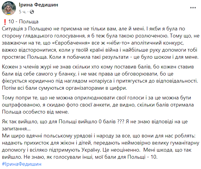 Ирина Федишин заявила, что лично она поставила Польше 10 баллов и не знает, почему в итоге Польша получила ноль от Украины.