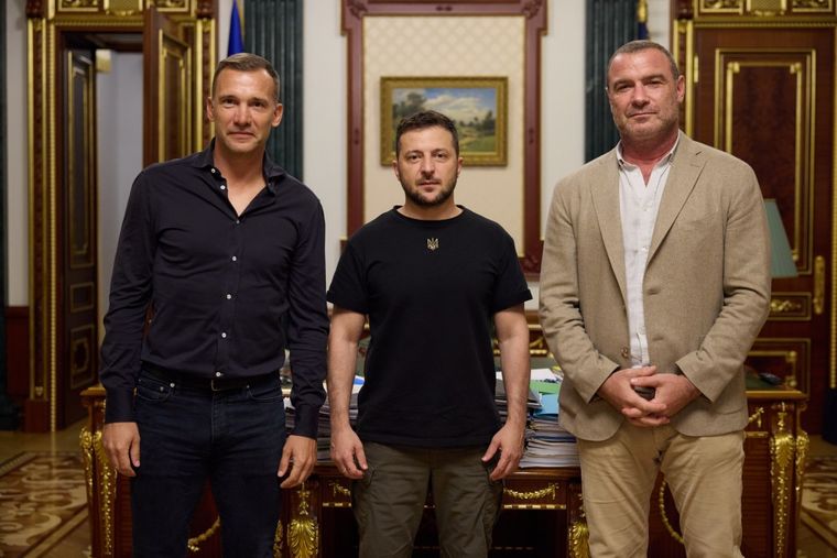 Президент Украины Владимир Зеленский встретился с амбассадорами фандрейзинговой платформы UNITED24 – украинской звездой футбола Андреем Шевченко и американским актером Ливом Шрайбером.