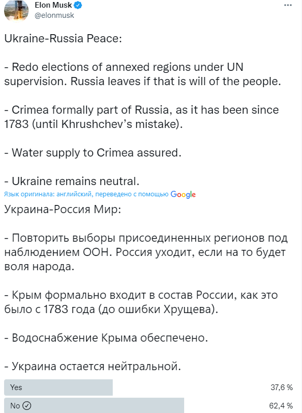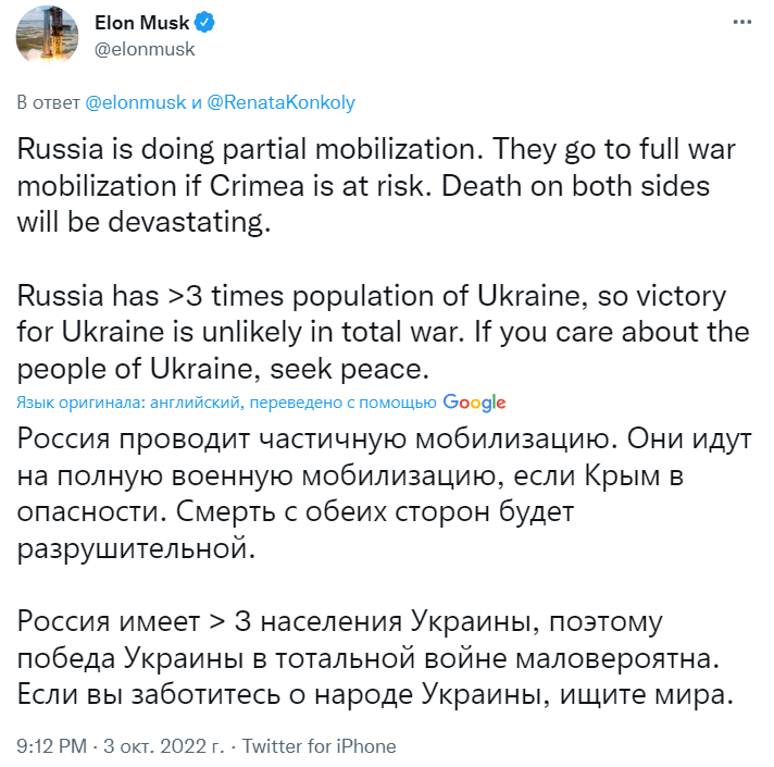 После этого Маск написал, что РФ проводит частичную мобилизацию и пойдет на полную военную мобилизацию, если Крым будет в опасности. В таком случае будет много смертей с обеих сторон.