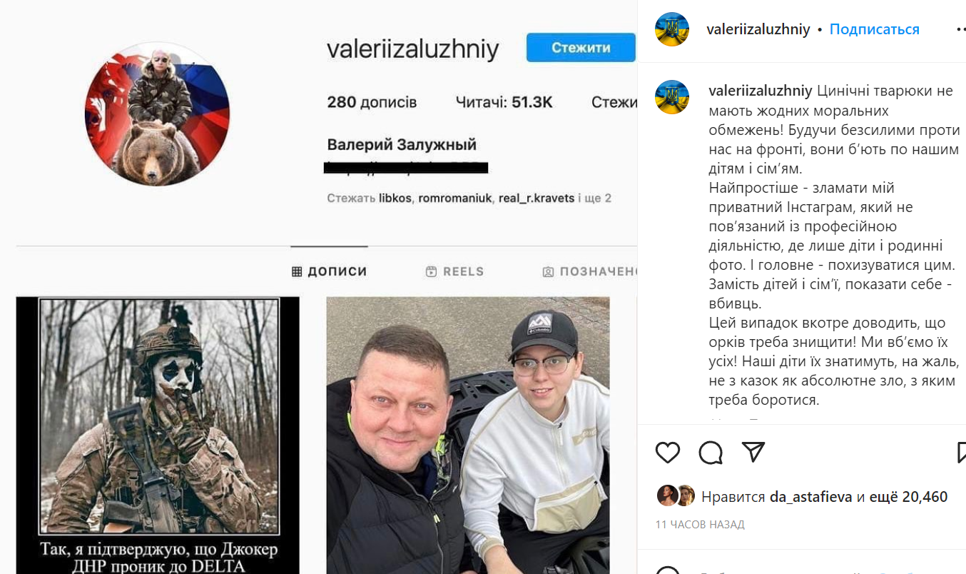Личная страница в Instagram главнокомандующего ВСУ Валерия Залужного была взломана российскими хакерами.