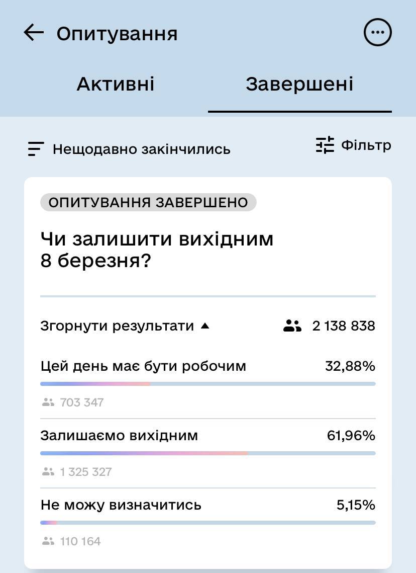 В опросе приняло участие более 2,1 млн граждан. Украинцы проголосовали за то, чтобы оставить 8 марта выходным. За это высказаться более 1,3 млн человек.